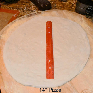 A good fresh dough that has completed it's final rise can be stretched to the desired size. This can be done with your hands. If it only goes a little way, cover with a towel, wait 5 minutes and keep going. The relaxation period will let you stretch it further. But first, here's a trick that makes a big difference: After stretching the dough just a little bit, use your fingers to dimple the dough, creating a rim about 1" in from the edge. Turn it over and do it again. This effectively makes an edge that will puff up. Not only does it look nice and make a nice handle to eat the pizza, we like the taste of the slightly burnt bubbles that often are created. After making the rim, continue stretching to the desired size.