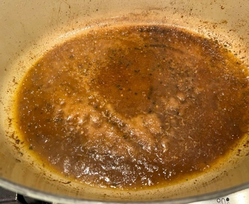 Once the veggie mixture is to your liking add mixture to crockpot topping the meat. The mixture should have a deep rich brick like color.