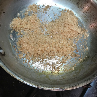 Using a small food processor or blender, grind the bread slices with the minced garlic clove. Heat some olive oil in a medium frying pan, add the crumb mixture, and fry until light brown. Transfer to another container (like a cool frying pan) to stop the cooking.