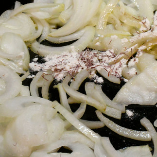 Add the flour, saffron and onions to the pan. Add any remaining salt/cayenne mixture. Stirring continuously to wilt and lightly brown the onions (about 10 minutes) cook over medium-high heat, scraping the bottom of the pan to loosen any browned particles.